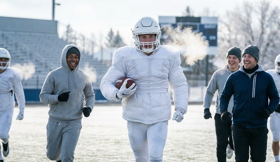 Games are short bursts of high intensity. Practice is longer exposure at moderate intensity with more standing around. The layering strategy is different for each. Game day means minimal layers during play. A base layer under the uniform is usually enough once moving. Wear a warm jacket and sweatpants during warm-up, strip down before kickoff. Keep a hat and gloves for the first few minutes, then pull them off.