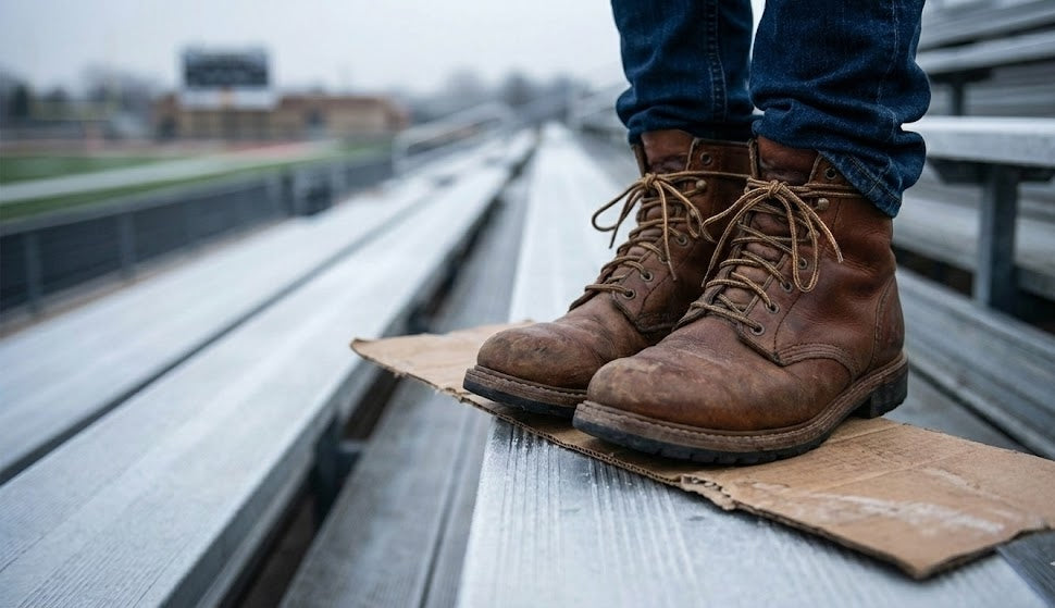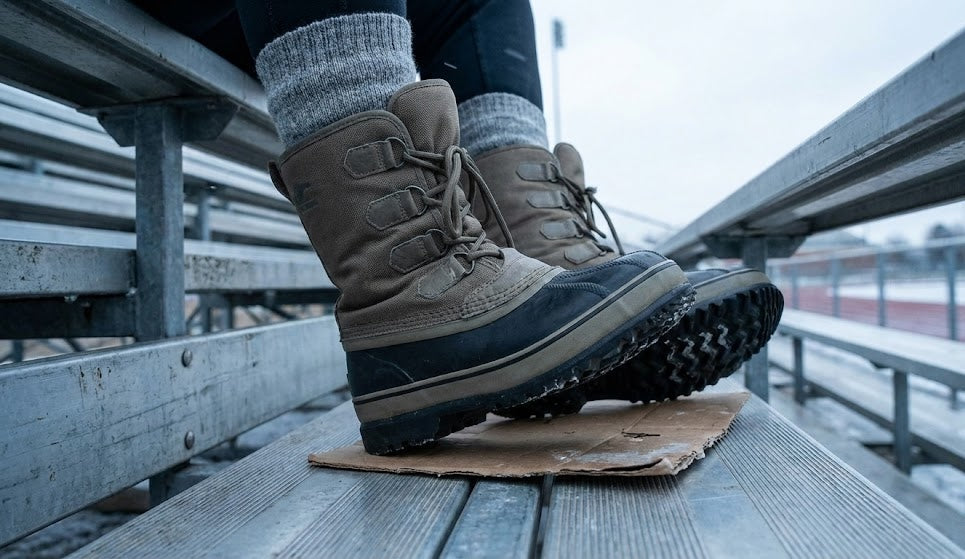 The fix comes in three parts: better soles, better socks, and a barrier. Boots with thick soles or 200+ grams of insulation should work for stationary cold. If you're not wearing boots, bring cardboard to stand on. Sounds ridiculous. Works perfectly. The cardboard creates an insulating layer, and you'll feel the difference immediately.