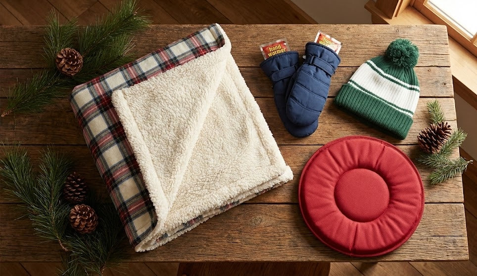 A stadium blanket should be first. Look for fleece that's at least 400 grams per square meter, or anything sherpa-lined. GSM measures blanket density like ounces measure hoodie fabric weight: higher numbers mean thicker and warmer. The sherpa or thick fleece versions will beat single-layer options. Waterproof backing stops moisture from the bleachers soaking through.