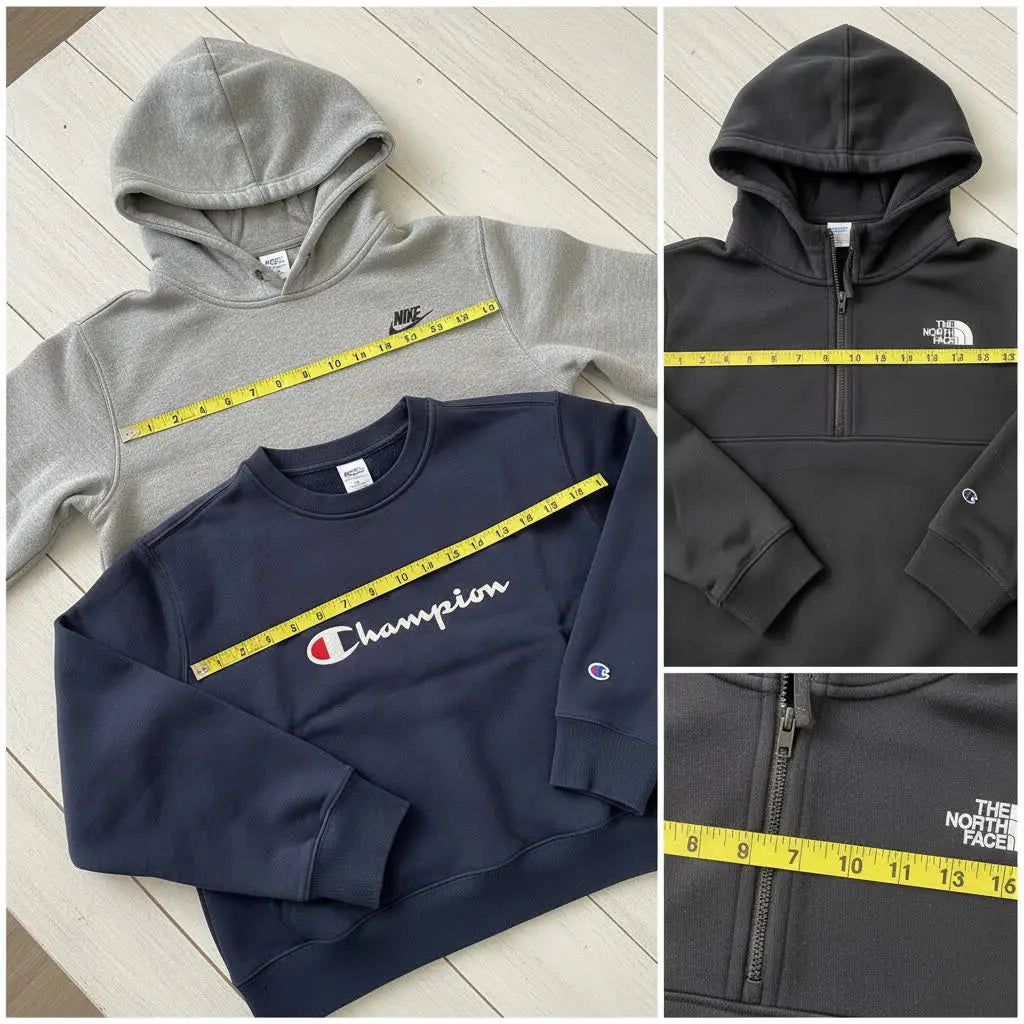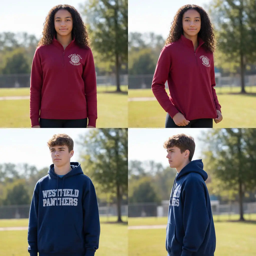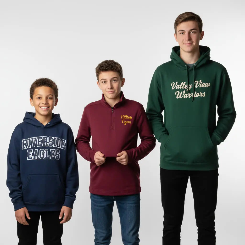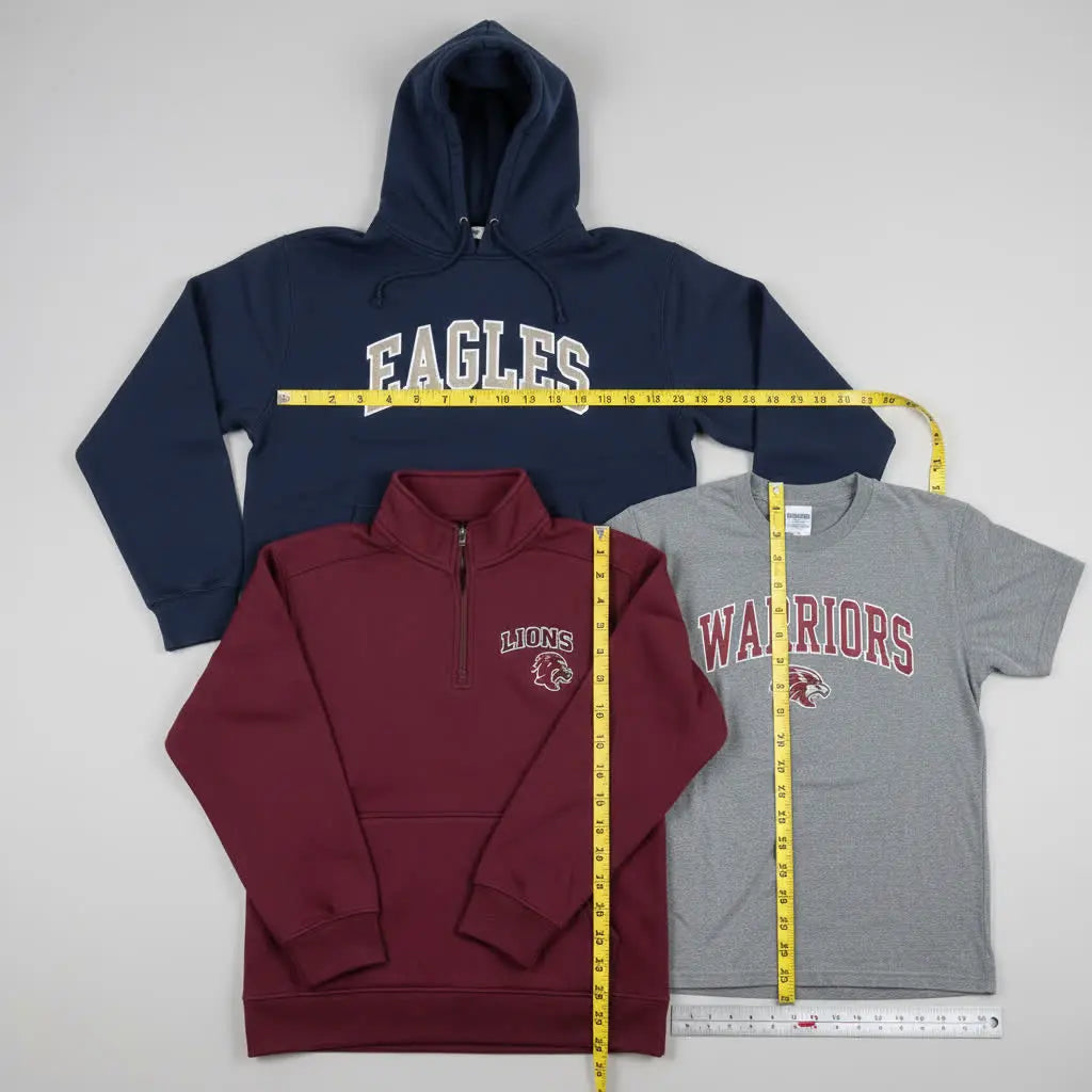 The biggest mistake parents make is assuming all spirit wear fits the same way. A youth large hoodie from Nike fits nothing like a youth large from Gildan, and Champion falls somewhere in the middle. These aren't small differences - they can mean a full size variation in how an item actually fits your child. Nike tends to run small across their entire product line, which means if your child typically wears a youth medium in most brands, they'll probably need a youth large in Nike spirit wear. This applies to hoodies, quarter-zips, and t-shirts. The athletic cut Nike uses is designed closer to the body, so there's less room for layering or growth. Champion fits true to size for most children and adults, making it the safest bet when you're unsure. If your child wears a youth large in their regular school clothes, a Champion youth large will likely work well. The fabric also tends to have a bit more give than Nike, particularly in their sweatshirts and hoodies. North Face runs slightly large, especially in their outerwear. A North Face quarter-zip or jacket in youth large might fit more like an adult small from other brands. This is actually useful for parents who want items to last longer, but it can look oversized if you're aiming for a fitted look. Budget brands like Gildan and Port & Company tend to run true to size but with a boxier, looser fit. These work well for layering or for children who prefer more relaxed clothing, but they don't have the same tailored look as premium brands.